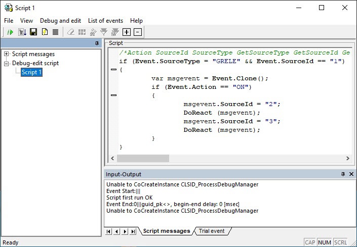 The debugging windows of the All script messages type are displayed in the Script messages list. The names of the debugging windows match the names of the corresponding Script objects. These windows display all system messages related to the corresponding script. The example of the debugging window of the All script messages type: