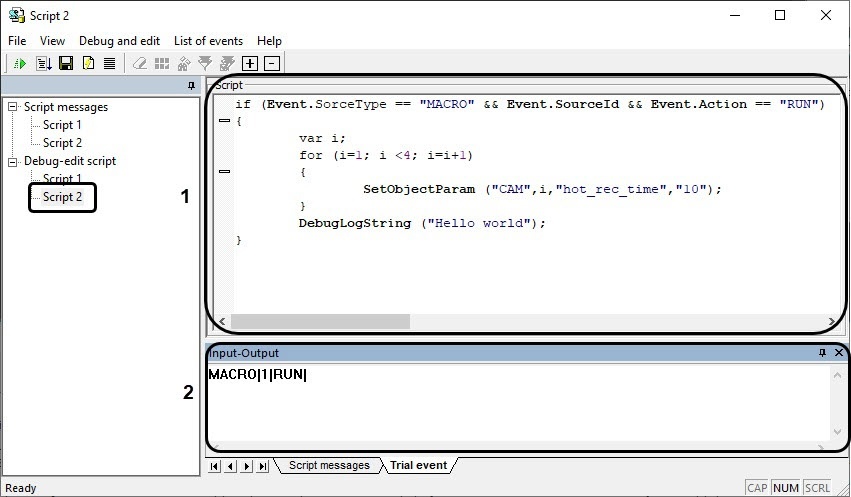 The Debug-edit scrip tab is used to edit scripts and create test events.