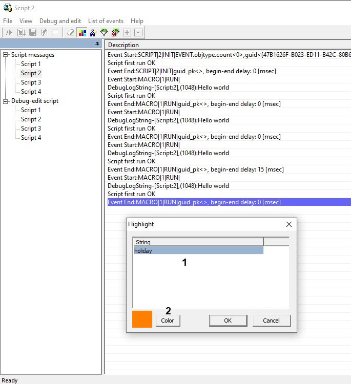 The Highlight dialog window is used to set the color highlighting of the lines containing specified words in the debugging window.