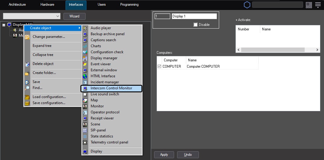 Click the right mouse button on the selected Display object and choose the Create objects - > Intercom Control Monitor item from context menu.