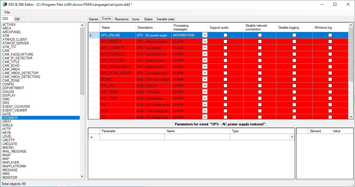This tab contains the list of the system events that the selected object can create. Each event has the following editable parameters: