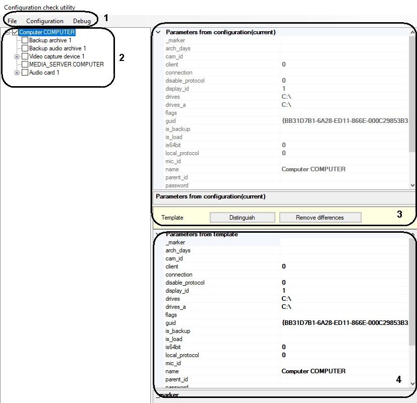 The objects tree of Axxon PSIM software is displayed here. Clicking the left mouse button on any object in the objects tree, the configuration of its parameters is displayed in parameters field (points 3-4). - The field of object parameters from Axxon PSIM configuration (3).