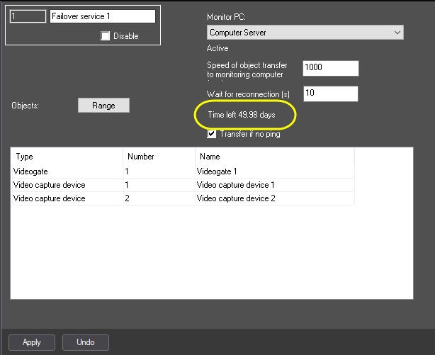 If the quantity of cameras is bound to specific Servers in the security key, then the license becomes invalid when cameras are moved to the backup Server. In this case the system gives 50 days to restore the failed Server in order to move the cameras back and the license to become valid again. Otherwise, Axxon PSIM will unload on the backup Server because the hardware limit is exceeded (see Specifics of the Axxon PSIM operation when the object limit is exceeded). The time (in days) remaining for restoring the main Server is displayed on the settings panel of the Failover service object: