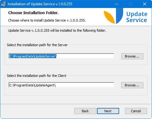 A window for selecting the installation path for the Server and Client opens. By default, the Server is installed in C:\ProgramData\UpdateServer\, the Client is installed in C:\ProgramData\UpdateAgent\: