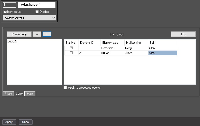 To create a logic, go to the settings panel of the Incident handler object, select the Logic tab, and create a logic in one of the following ways: