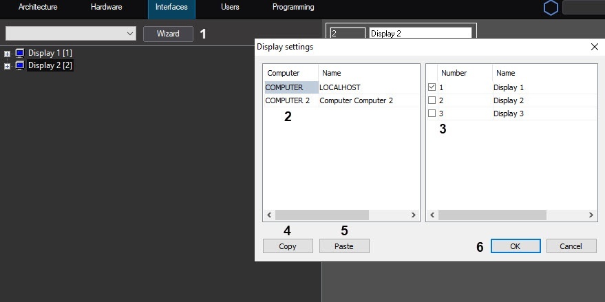 Use the Copy (4) and Paste (5) buttons to copy the display list. For example, to assign the same displays to the COMPUTER 2 computer as those assigned to the COMPUTER computer, do the following: