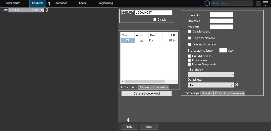 To allow starting the system without specifying the password, default user is to be set up. The administrative, controlling and viewing functions will be limited according to the rights of the default user.