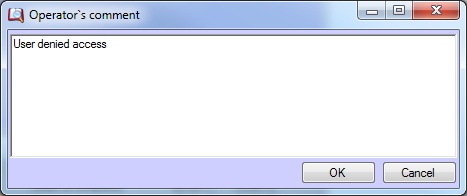 If Operator's reaction checkbox was set at step 2, then after you click the Do not open button, a window is displayed where you should enter a comment to complete the action. Until you enter a comment, the OK button will be inactive.