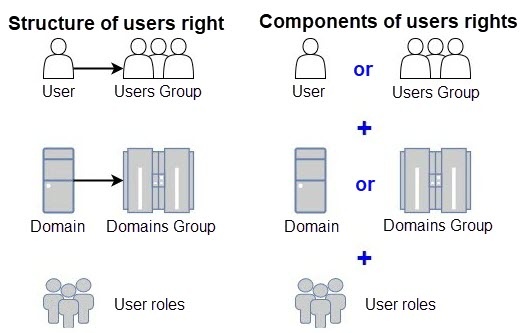 When configuring user rights, users of the Admin and Tech-Support roles can create user groups and domain groups (see Creating users, user groups, domain groups), that will form a hierarchical structure.
