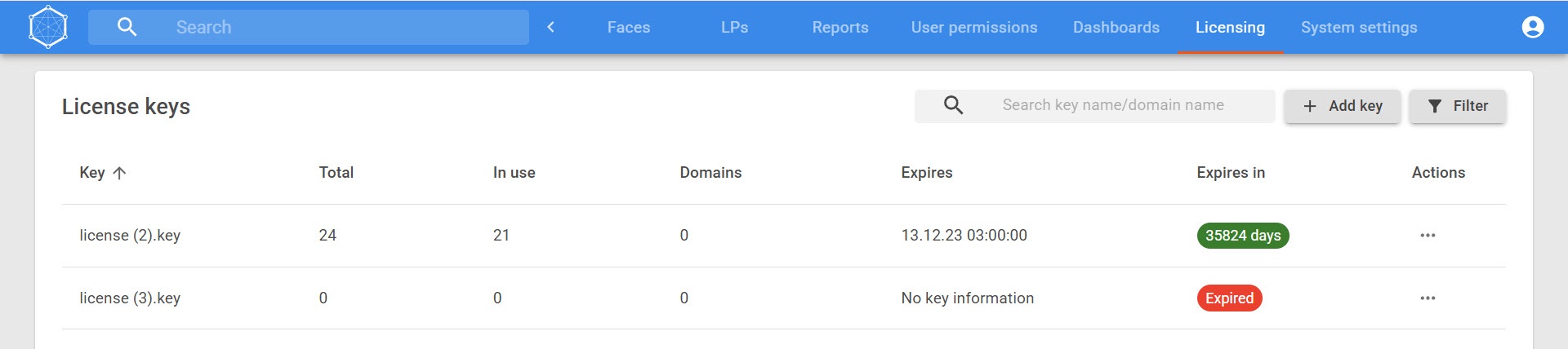 You can use the Licensing tab to manage license keys. In the tab, you can add new keys, view their expiration dates, and view the number of available licenses and modules.