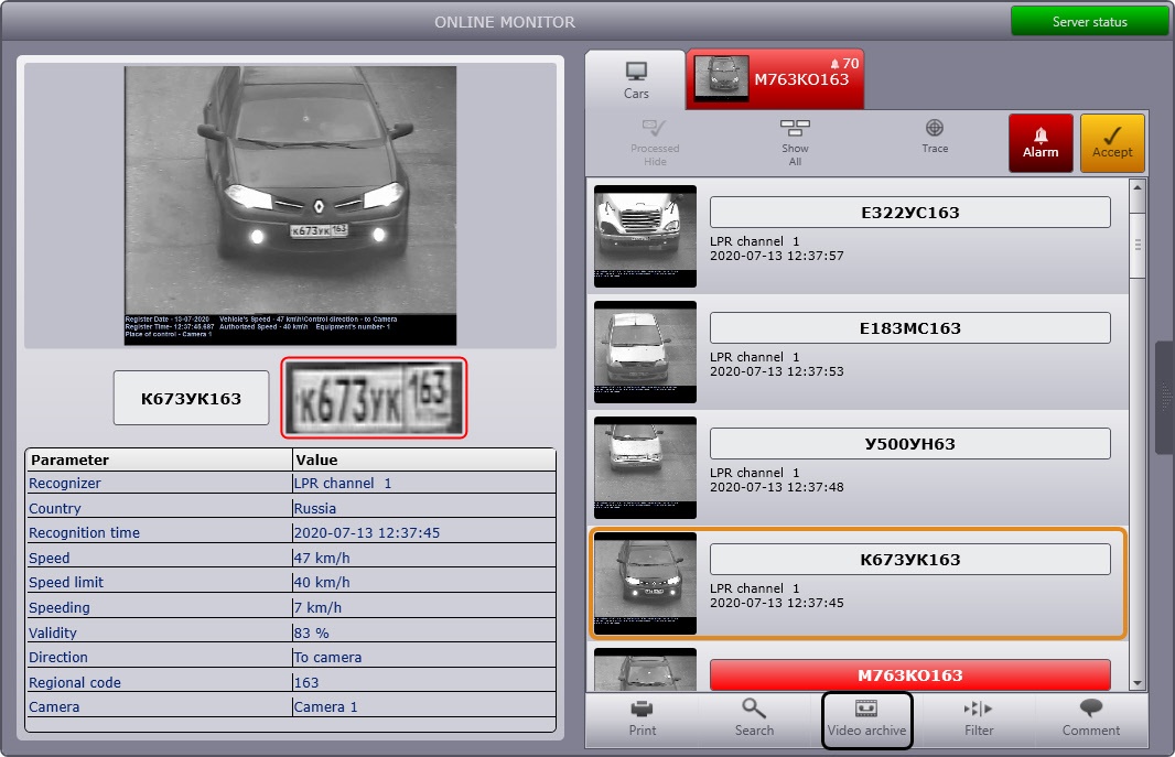 You can view the video archive by event from a video camera which is used for the license plate recognition.