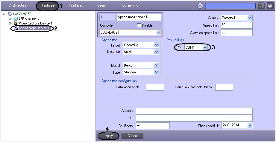 Several COM ports should be set up one by one. Each speed-trap device is represented by a separate Speed traps server object created and set up in the Hardware tab of the System Settings window.