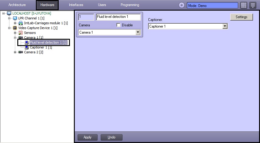 The Fluid level detection module is configured on the Fluid level detection object settings panel. This object is created on the basis of the Camera object on the Hardware tab of the System settings window.
