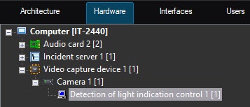You can configure the Detection of light indication control module on the settings panel of the Detection of light indication control object that is created on the basis of the Camera object on the Hardware tab of the System settings window.