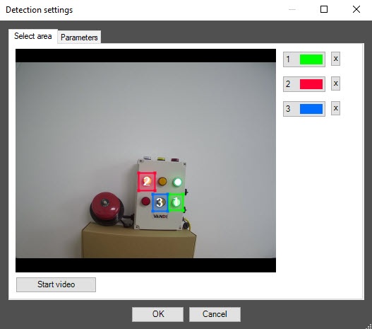 - On the video image, specify the location of the light sources that you want to monitor with the detector. For this, on the captured video image, specify detection areas by clicking in the frame and stretching the bounding border to the required size. The detection areas are numbered in the order of creation, starting from one. When you add an area, the button corresponding to this area is displayed to the right of the video image.