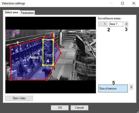 - On the captured video image, set the approximate person size. To do this, use the left mouse button to select the rectangular area (4).