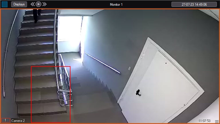 If you set the Display event on screen checkbox (see Configuring the Handrail grip detection), when the detection tool triggers, an alarm border of the color specified in the settings appears in the monitor window.