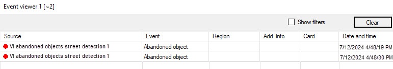 In case of an alarm in the surveillance area, the corresponding message Abandoned object from the VI abandoned objects street detection object is received in the Event viewer interface window. When an alarm in the surveillance area stops, the Triggering end event is received. See also VI abandoned objects street detection.