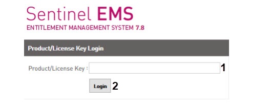 In the dialog box that opens, enter the received security key in the Product/License Key field (1) and click Login (2).