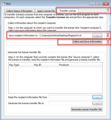 - Click the Generate License Transfer File button (3) to generate a license file.