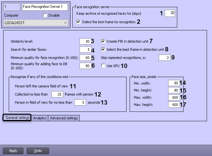 | 15 | Min. height | Enter the value into the field | Sets minimum height of a captured face for face recognition in pixels | Natural number | 80 | >=0 |