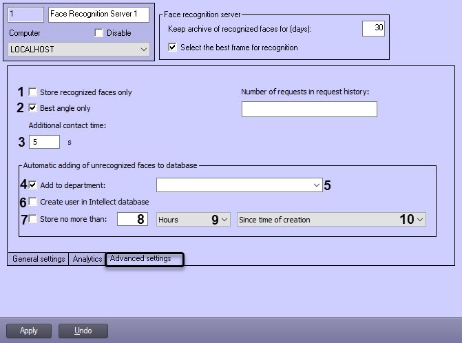 1 | Keep archive of recognized faces (days) | Enter the value into the field | Sets the storage period for the Recognized Faces Archive | days | 30 | From 1 to 9999 |