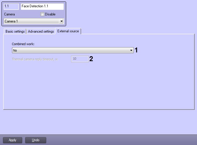 | 1 | Combined work drop-down list | Select the value from the list | Sets the combined operation mode with a thermal camera or an external system | List | No | No - combined operation mode is not used. Combine with thermal camera temperature - receiving the temperature and coordinates of a captured face frame from the thermal camera. A photograph of a captured face will be obtained from the capturing camera. Get photo from thermal camera - receiving the temperature and photos of a captured face from the thermal camera. Get photo and metadata from external system - receiving the temperature and photos of a captured face from a thermal camera or Axxon Next. |
