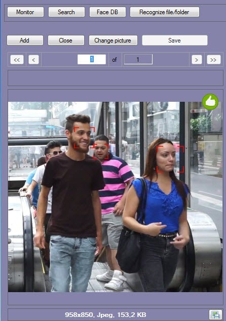 If there are several faces on the added image, they are framed with a red frame and the Save button is disabled. To add a person to the reference face database, left-click on one of the framed faces.Important!