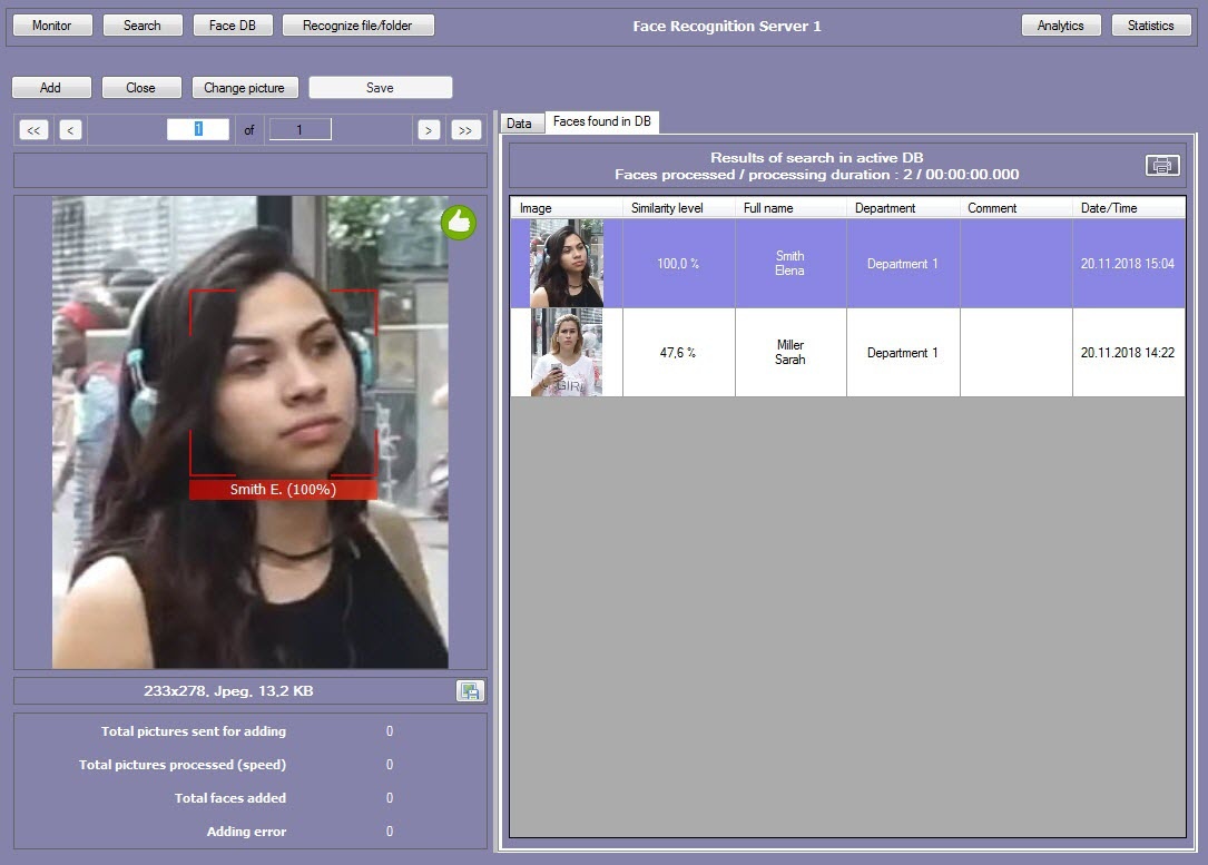 All images added to the reference face database are also listed on the Faces found in DB tab, which contains the following information: