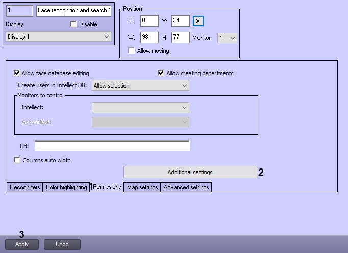 1. Go to the Permissions tab (1) of the Face recognition and search object settings panel.