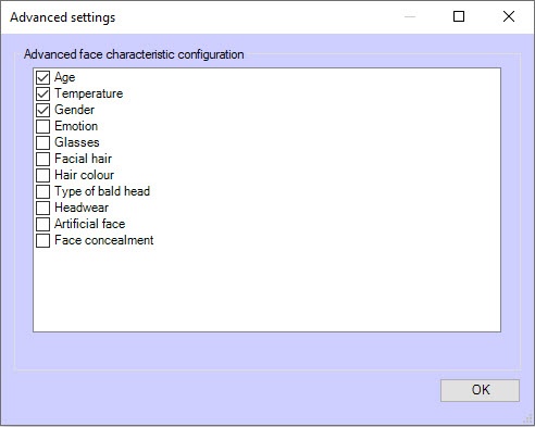 Configuring the additional face characteristics consists in selecting those face characteristics that should be available in the Face recognition and search interface window (see Working with the Face recognition and search interface object). As a result, in the analytics viewing mode, and in the monitoring of captured and recognized faces mode, the columns of the corresponding face characteristics will be displayed. Filtering by selected face characteristics will also become available.