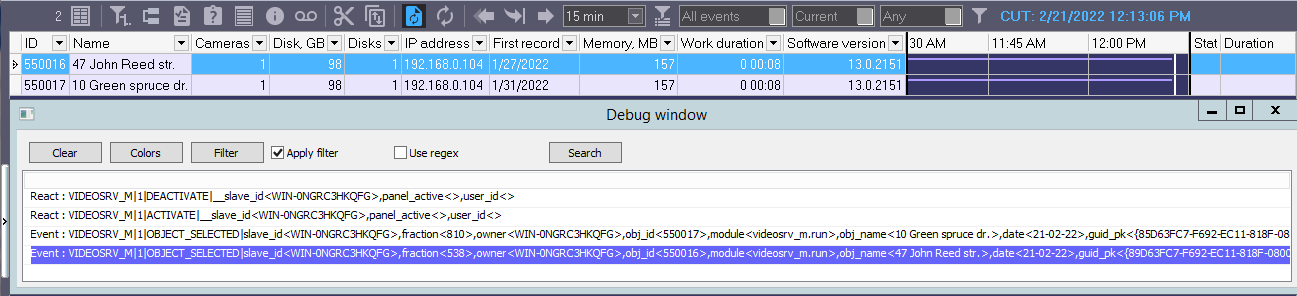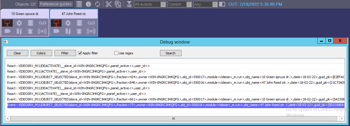 Selecting an object on the Log Panel
