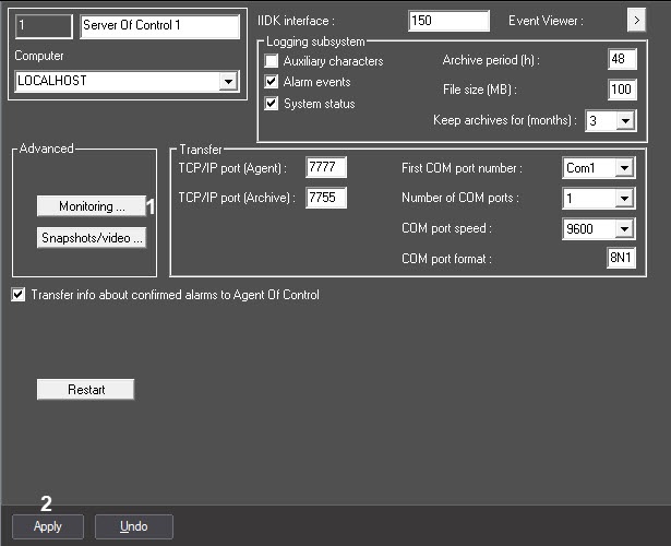 - To save the changes, click the Apply button (2) on the settings panel of the Server Of Control object.