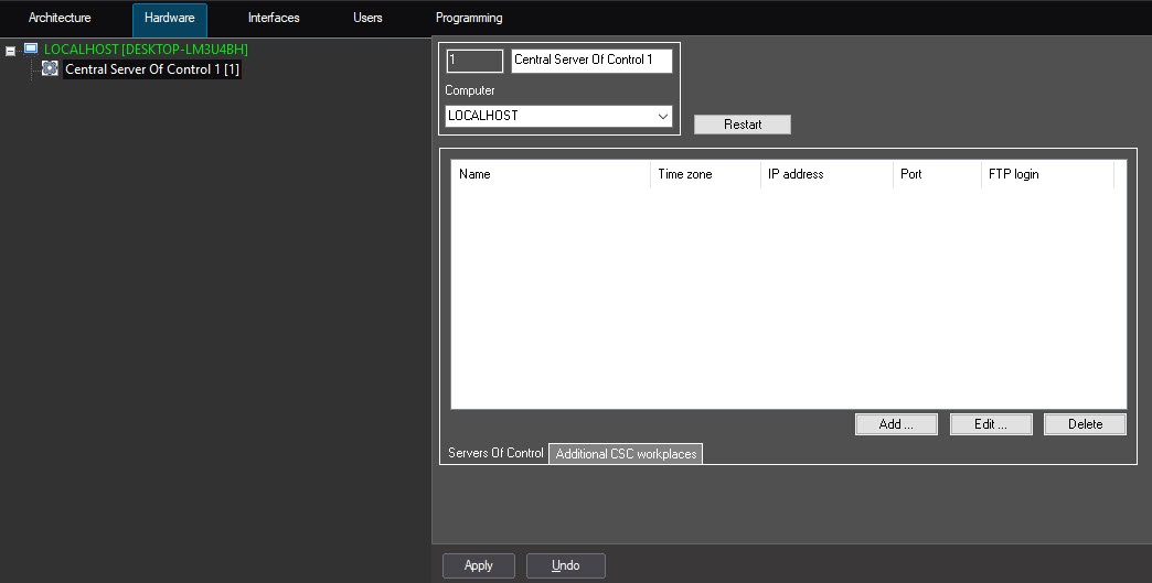 Create the Central Server Of Control object in the hardware tree as follows: