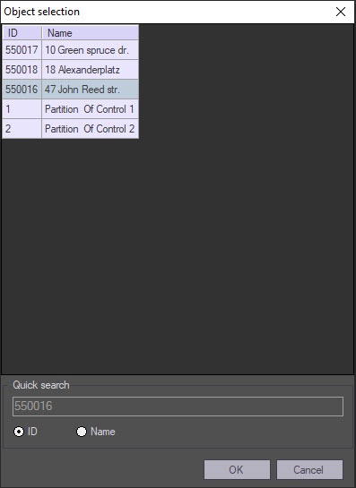 - For quick search by object identification number, set the switch in the bottom of the box to ID and enter the number in the Quick search field. The match, if found, is displayed in the Quick search field while the corresponding object is automatically selected in the list.