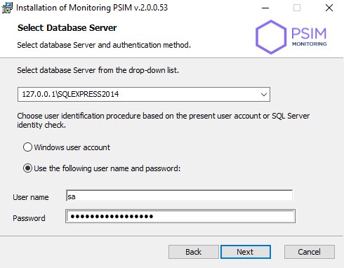 Select the MS SQL database server and specify the connection parameters. For more details, see Installation of Axxon PSIM™ as a Server/Remote Administrator's workplace. To continue the installation process, click the Next button.