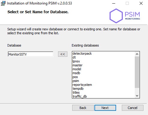 By default, the name of the database is "MonitorSSTV", and its files are stored in the SQL Server folder.