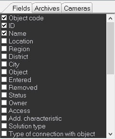 The lower part of the area contains three tabs: Fields, Archives, and Cameras. Information on the selected parameters is displayed as columns in the main list of the Details window.