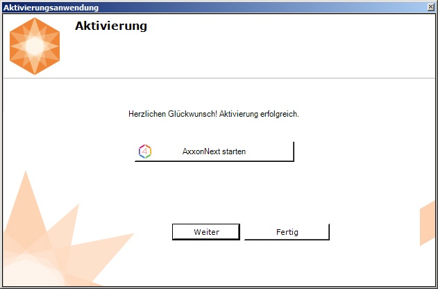 Klicken Sie auf Weiter, um zur Startseite des Aktivierungstools zurückzukehren. Klicken Sie zum Beenden auf Fertigstellen. Um das Dienstprogramm zu schließen und den Axxon Next Client zu starten, klicken Sie auf AxxonNext starten.