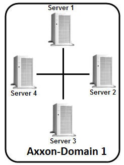 Die Axxon-Domain ist eine ausgewählte Gruppe von Computern, auf denen die Server-Konfiguration des Axxon Next Software-Pakets installiert ist. Die Verknüpfung von Servern in einer Gruppe ermöglicht ihre Zusammenarbeit im weiteren Verlauf, so dass sich ein verteiltes System organisieren lässt.