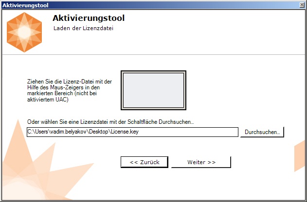 - Ziehen Sie die Lizenzdatei in den hervorgehobenen Bereich (1).