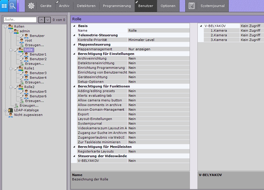 In der Softwareplattform Axxon Next sind jedem Systembenutzer durch irgendeine Rolle definierte Rechte zugewiesen.