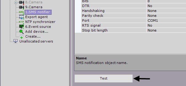- In the list of devices, select the SMS notifier object which needs to be configured (1).