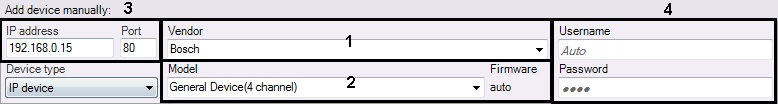 1. In the form for manually adding an IP device, select the device manufacturer from the list (1).