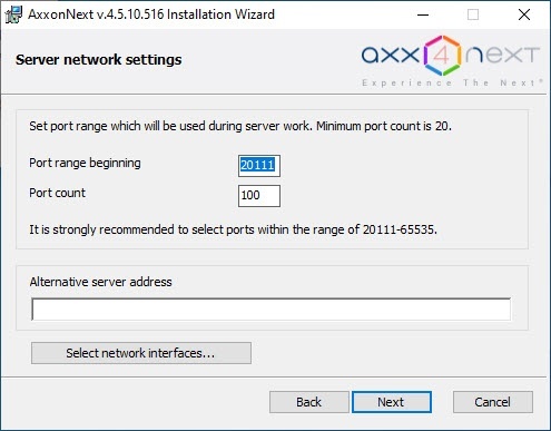 For a full list of ports, see Ports used by the Axxon Next Software Package.