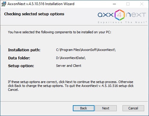 - Verify your installation settings and click the Next button to begin installation of Axxon Next.