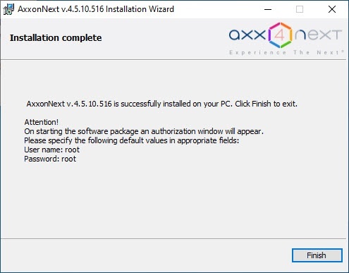After installation, a new dialog box will appear informing you that the installation of Axxon Next is completed. - Click the Finish button to confirm completion of the installation.