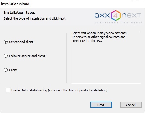 Server and Client — installs Client and Server services. Axxon Next Server: