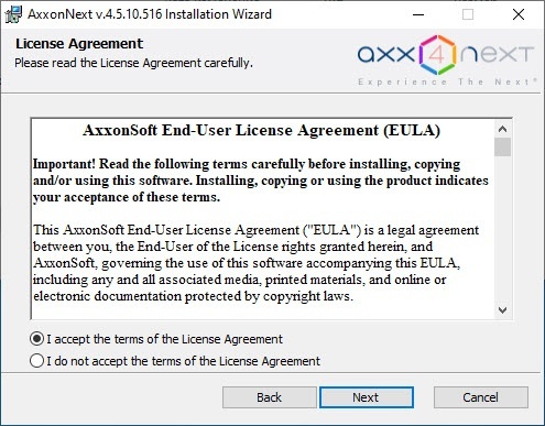 By default, Axxon Next will be located in the C:\Program Files\AxxonSoft\AxxonNext\ folder.