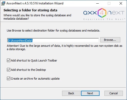 The option for choosing the folder for storing the log database and the metadata database is available starting from Axxon Next 4.5.10.Attention!